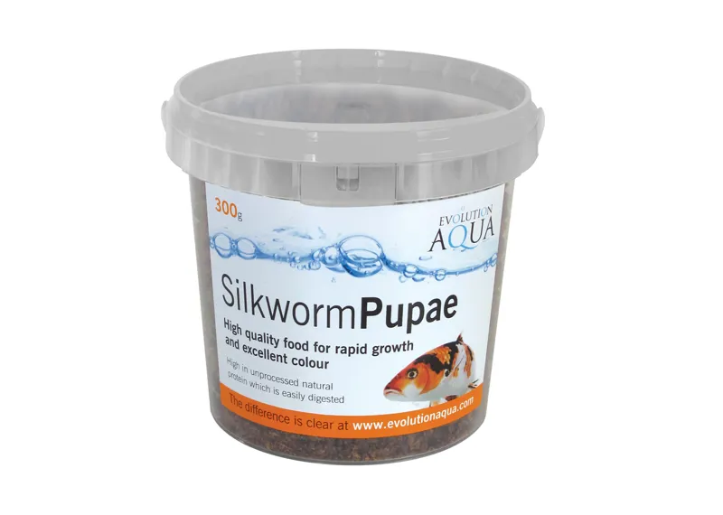 Evolution Aqua silkworm pupae are an excellent and powerful supplementary feed for koi. Made from the highest quality silkworm pupae, they are carefully dried out to retain all the goodness with no additives or preservatives included. This product is an ideal food due to it being rich in proteins. It not only increases the growth rate of your koi but also enhances the colours. Silkworm pupae can be fed as a daily ‘treat’ or as a powerfood at maximum of 30% of total food volume. Due to the high protein and fat content values, it is recommended not to feed below temperatures of 15C/59F. To improve the digestion ability of your koi further, put the pupae in warm water for half an hour before use.