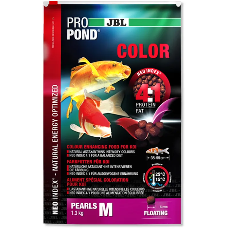 Feeding Recommendation: Feed once or twice a day as much as can be eaten in a few minutes.  JBL Propond NEO Index The new JBL Propond food is the only physiological – nutritional concept on the market. Even if your pond fish are always hungry and greedily eat any food they can get, it is important to get to grips with the subject of the correct nutrition. Which factors are really important? It is not enough to select a food which is appropriate for the season. Proper nutrition needs to provide energy at the right time and in the right place. JBL’s scientists have summarised all these factors in an index, that they named the NEO INDEX ( natural, energy-optimised nutrition). For the first time ever, JBL pond foods will give you over 100 articles which are created on the basis of the following criteria: animal size, age, function and water temperature, along with the corresponding protein / fat ratio.  JBL Propond Color This feed will bring out the colours of your fish and also make sure that the fish will retain their beautiful colours after purchase. Color feed will also help younger fish (mostly two years old) to develop their colours properly when they are 3-5 years old. If you feed your fish with Propond Colour their colours will show up more intensely, even at an older age.Â