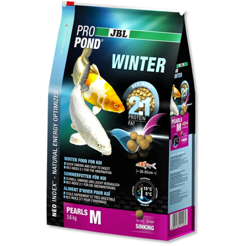 Feeding Recommendation: Feed once or twice a day as much as can be eaten in a few minutes.  JBL Propond NEO Index The new JBL Propond food is the only physiological – nutritional concept on the market. Even if your pond fish are always hungry and greedily eat any food they can get, it is important to get to grips with the subject of the correct nutrition. Which factors are really important? It is not enough to select a food which is appropriate for the season. Proper nutrition needs to provide energy at the right time and in the right place. JBL’s scientists have summarised all these factors in an index, that they named the NEO INDEX ( natural, energy-optimised nutrition). For the first time ever, JBL pond foods will give you over 100 articles which are created on the basis of the following criteria: animal size, age, function and water temperature, along with the corresponding protein / fat ratio.ÂÂ