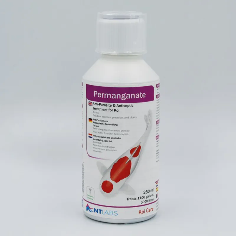 Permanganate can be used as a whole pond treatment to treat parasitic infections from Costia, Trichodina, Chilodonella, etc, or as a dip treatment in a separate volume of water to treat fish lice and leeches, and for cleaning ulcers.