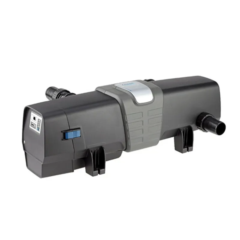 The revolutionary UVC clarifier Bitron Eco with 180 W power removes floating algae and harmful bacteria with maximum efficiency.Thanks to the automatic bypass regulation and the significantly enlarged housing, an optimal irradiation result is always guaranteed, even with changing flow rates of up to 50,000 l / h.The clever eco-control regulates the irradiation time depending on the seasonal needs.This enables energy savings of up to 50% to be achieved!You can also save on the light sources, because the newly developed 60W UVC lamp has a service life of 12,000 hours that is 50% longer.In addition, changing the lamp is now child’s play and without dismantling the quartz glass.The proven automatic cleaning system is also included,an LED UVC control as well as a display for lamp change and water temperature.Thanks to the protection class IP68, the Bitron Eco can be set up directly on or even in the pond.The cable length is 5 m, the nominal voltage 220 – 240/50 Hz. The Bitron Eco enables a 1 1/2 “and 2” connection.Optimal for connection to ProfiClear, BioTec 30, BioTec ScreenMatic 36. You receive a guarantee of 2 years + 1 year requirement guarantee.