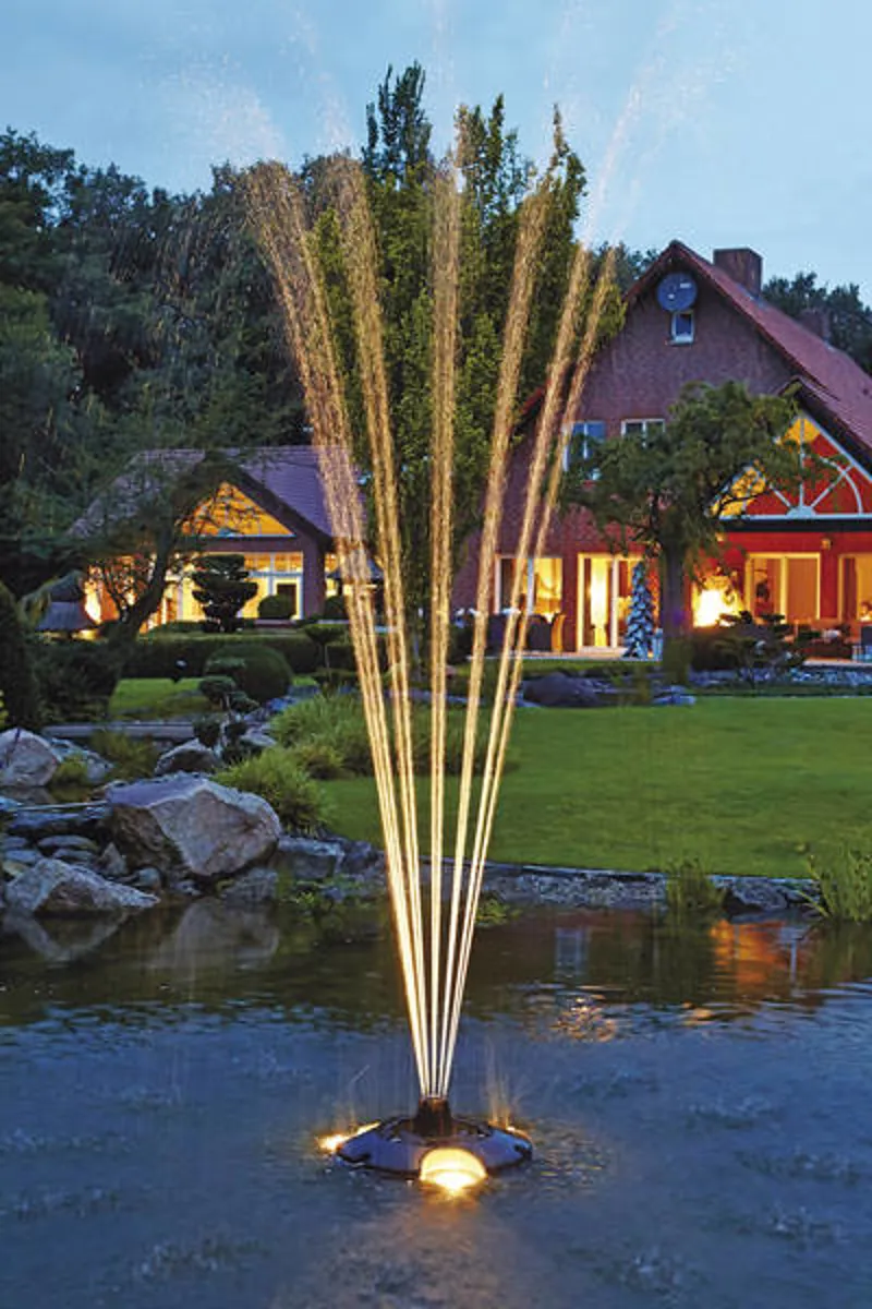 The Oase Pond Jet Eco Floating Fountain Pump can be illuminated with the Oase Pond Jet Floating Fountain Light Set to create stunning displays.Â