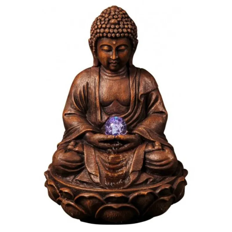 The water bubbles from the Buddha’s hands through a glass sphere of light and slowly trickles over the Buddhas lap and down through his crossed legs. The glass ball that the Buddha holds in his hands spins giving a magical light effect and creating a beautiful water feature.