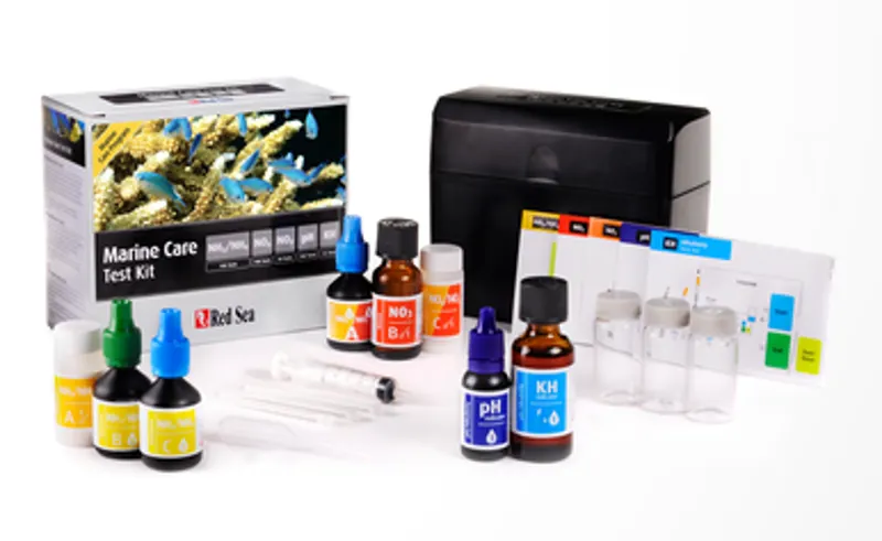 The Marine Care Kit includes the tests pH, KH, ammonia, nitrate and nitrite in a durable, chemical-resistant plastic box.